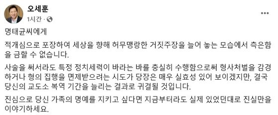 오 시장은 30일 본인의 페이스북에 ‘명태균씨에게’라는 서두로 “적개심으로 포장하여 세상을 향해 허무맹랑한 거짓 주장을 늘어놓는 모습에 측은함을 금할 수 없다”며 강하게 비판했다. 그러면서 “진심으로 당신 가족의 명예를 지키고 싶다면 지금부터라도 진실만을 이야기하라”고 강조했다.