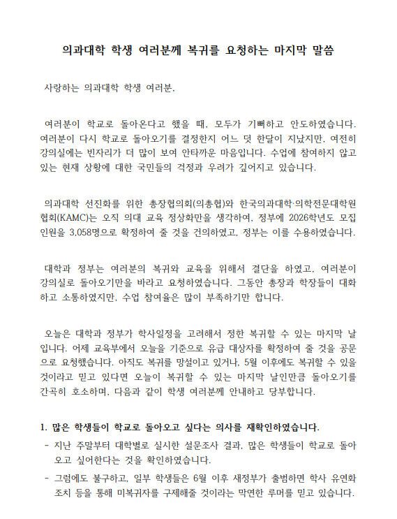 의대가 있는 전국 40개 대학 총장 모임인 ‘의과대학 선진화를 위한 총장협의회’(의총협)는 이날 ‘의과대학 학생 여러분께 복귀를 요청하는 마지막 말씀’이란 입장문을 냈다.