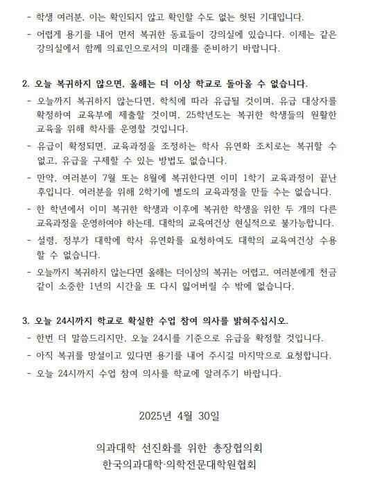 의총협은 유급 시한이 넘으면 올해는 더이상 학교로 돌아올 수 없다는 점을 강조했다. 이들은 “오늘까지 복귀하지 않는다면 학칙에 따라 유급될 것이고, 25학년도는 복귀한 학생들의 원활한 교육을 위해 학사를 운영할 것”이라며 “오늘 복귀하지 않는다면 올해는 더이상의 복귀는 어렵고, 여러분에게 천금같이 소중한 1년의 시간을 또 다시 잃어버릴 수 밖에 없다”고 밝혔다.