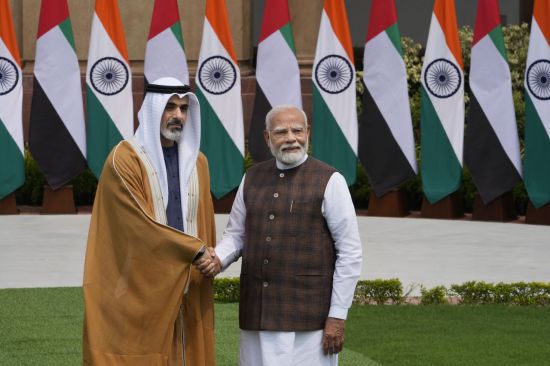 나렌드라 모디 인도 총리(오른쪽)가 2024년 9월 9일(현지시간) 뉴델리를 방문한 셰이크 칼리드 빈 무함마드 빈 자예드 알 나흐얀 아부다비 왕세자와 악수하고 있다. 30일 미국과 최초로 무역 합의를 이끌어내는 나라로 인도가 유력하게 점쳐졌다. 연합뉴스 |