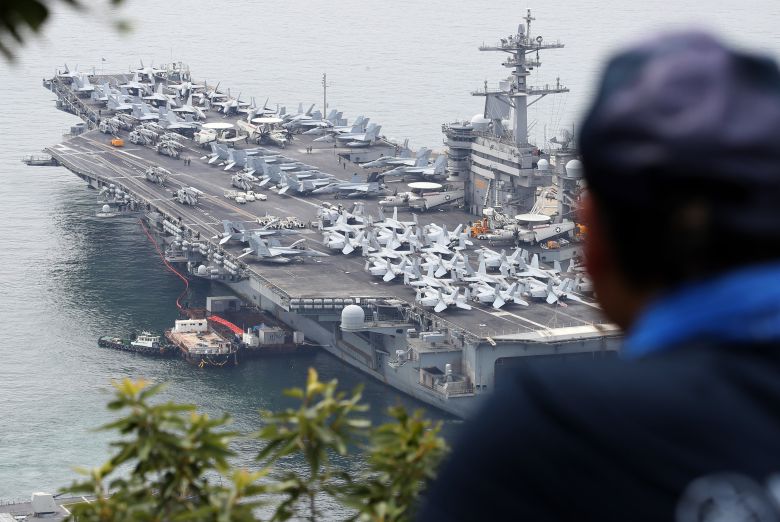 지난해 12월 군과 수사당국이 부산 해군작전사령부 인근에서 미국의 원자력(핵) 추진 항공모함 '시어도어 루스벨트'(CVN-71·10만t급)를 드론으로 불법 촬영 중국 유학생 3명에게 일반 이적 혐의 를 적용했다.사진은 2024년 6월 프리덤 에지 훈련 위해 부산서 출항하는 미 핵항모 루즈벨트함. / 김동환 기자