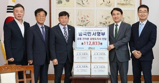 지난 2023년 4월 24일 강원도청을 찾은 이현종 철원군수와 박기준(왼쪽 두 번째부터) 철원군의장이 김진태(오른쪽 두 번째)지사에게 포천∼철원 고속도로 조기 착공 염원을 담은 범국민 서명부와 공동건의문을 전달한 뒤 기념 촬영하고 있다. 연합뉴스