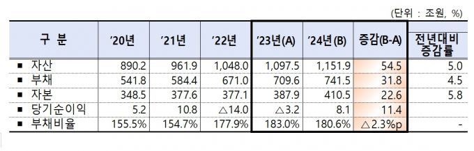 전체 331개 기관 중 산업은행·수출은행·기업은행을 제외한 328개 기관의 자산은 1151조9000억원으로 나타났다. 부채는 741조5000억원으로 부채비율은 180.6%다. 부채규모가 전년 대비 31조8000억원 증가했지만 경영여건 개선에 따른 당기순이익 흑자전환 등 자본 증가 효과로 부채비율이 2.4%p(포인트) 개선됐다.