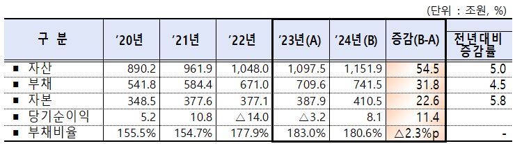 먼저 331개 공공기관 중 은행(산업은행, 수출입은행, 기업은행)을 제외한 328개 기관의 지난해 자산은 1151조9000억 원, 부채 741조5000억 원으로 전년대비 각각 5.0%, 4.5% 증가했다. 경영여건 개선에 따른 당기순이익 흑자전환 등에 자본이 5.8% 증가해 부채비율은 183.0%에서 180.6%로 2.3%포인트(p) 줄었다. 2021년 이후 3년 만의 감소다. 부채가 증가한 주요 기관은 주택금융공사(8조7000억 원), 토지주택공사(7조7000억 원), 도로공사(3조2000억 원) 등이다.