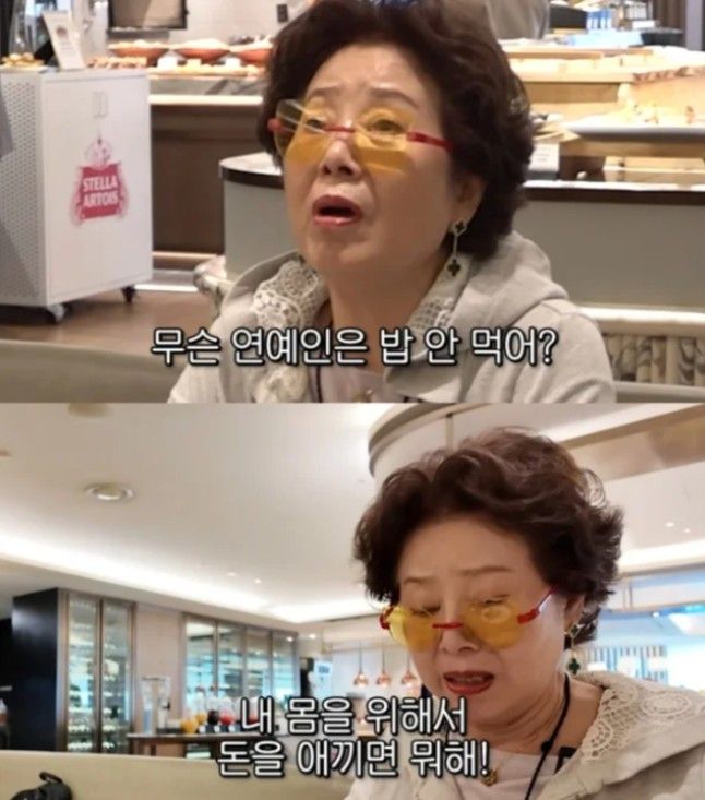 과거 영양실조, 뇌경색으로 쓰러졌던 선우용여는 “뷔페가 대중화됐으면 좋겠다. 내 몸을 위해서 돈 아끼면 뭐 하나, 돈 이고 지고 가냐. 옷은 몇천만 원짜리 사놓고 입에 들어가는 건 거지같이 먹으면 안 된다”며 “먹는 건 좋은 거 먹고, 입는 건 깨끗하게만 입으면 된다. 그리고 향수 좀 뿌리면 좋다. 그럼 내 몸이 ‘고맙다’고 한다”고 말했다.
