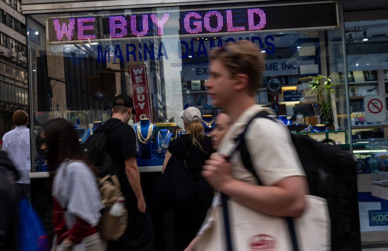 29일(현지시간) 미국 뉴욕 맨해튼의 보석상 앞을 시민들이 지나가고 있다. 미국발 관세전쟁의 여파로 금융시장이 흔들리면서 안전자산인 금의 가치가 높아져 금 가격이 온스당 3400달러를 넘어섰다.AFP연합뉴스 |