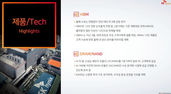 SK하이닉스는 "올해 HBM 매출은 전년대비 2배 성장할 것"이라며 "2분기 출고 HBM3E 중 절반이 12단 제품"이라고 내다봤다.