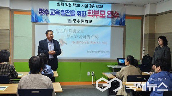 (영동=국제뉴스) 이재기 기자 = 충북 영동 정수중학교(교장 구홍서)는 29일 영동청소년상담센터에서 신춘옥 센터장을 강사로 정수교육발전 학부모협의체에서 주관하는 학부모 상담 연수를 실시했다.
