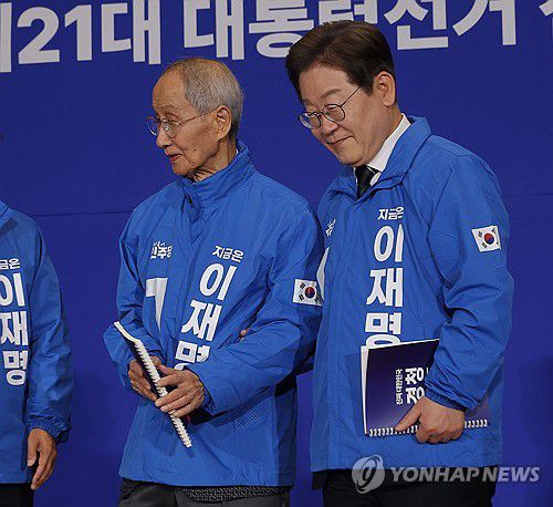 (서울=연합뉴스) 류영석 기자 = 더불어민주당 이재명 대선 후보가 30일 서울 여의도 국회 의원회관에서 열린 더불어민주당 제21대 대통령선거 '진짜 대한민국' 중앙선거대책위원회 출범식에서 기념촬영을 마친 뒤 상임 총괄 선대위원장을 맡은 윤여준 전 환경부 장관을 부축하고 있다. 2025.4.30