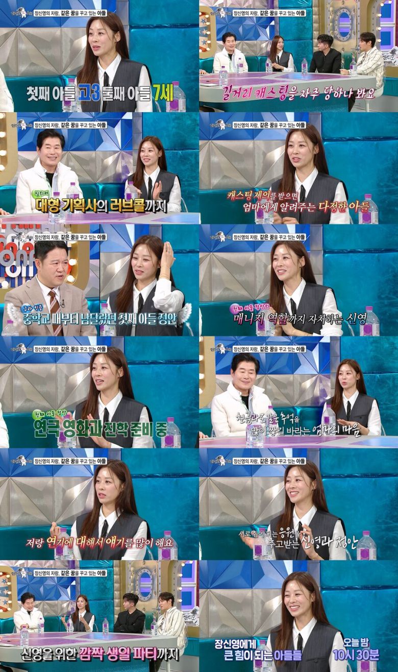 [스포티비뉴스=김현록 기자]‘라디오스타’를 찾은 배우 장신영이 두 아들에 대한 자랑을 쏟아낸다. 그는 자신과 같은 연기자의 꿈을 키우고 있는 ‘고3’ 첫째 아들이 길거리 캐스팅은 물론 대형 기획사의 러브콜까지 받은 사연을 공개핸다.