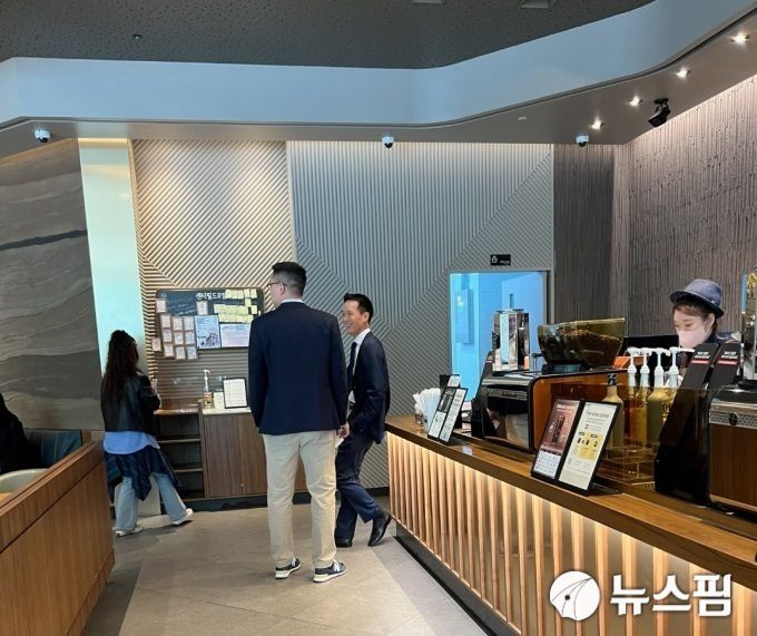 30일 오전 트럼프 주니어가 묵고 있는 서울 강남구의 한 호텔 인근 커피 매장에서 포착된 김동선 부사장(왼쪽)과 김동원 사장 [사진=독자 제공] |