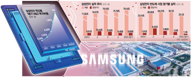 삼성전자(005930)의 ‘위기 경영’을 불러온 반도체 부문의 1분기 영업이익이 1조 1000억 원에 머물렀지만 일각의 우려와 달리 최악의 수준은 비켜간 것으로 평가된다. 고대역폭메모리(HBM)와 파운드리(반도체 위탁 생산) 사업 부진이 극심했지만 미국발 관세 폭탄에 대비해 서버나 스마트폰·PC 등의 사재기 수요가 증가한 덕이다. 삼성전자는 하반기에 본격적인 반도체 수익 반등을 기대하며 ‘상저하고’ 실적을 예고했는데 이는 HBM과 파운드리 부문에서 글로벌 빅테크 고객을 확보할지에 달렸다는 분석이다.