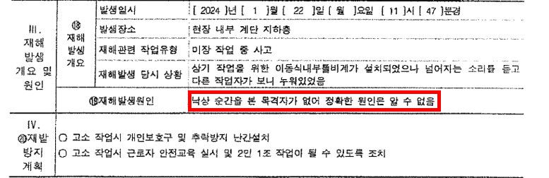 ‘재해발생원인’ 항목에 딱 한 문장 기재