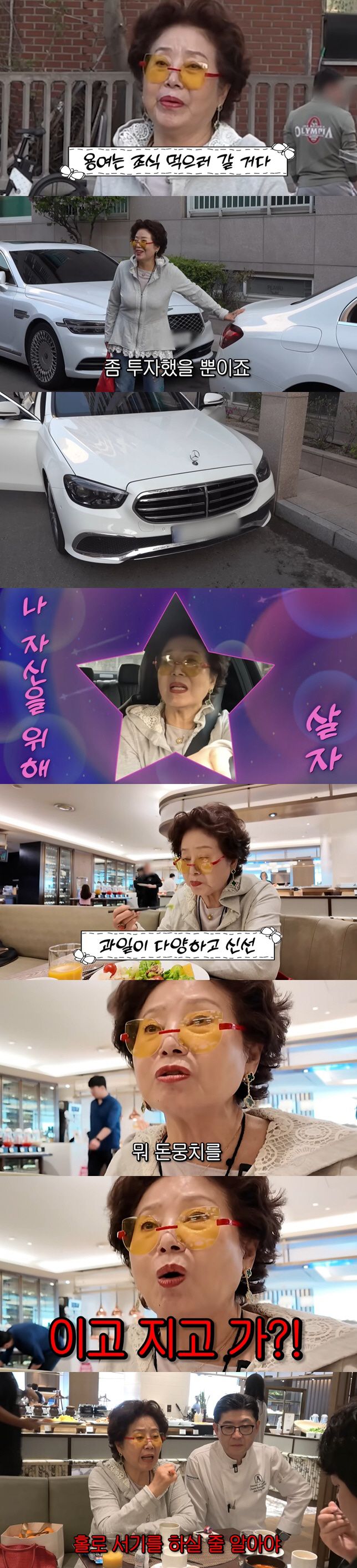 선우용여는 지난 27일 자신의 유튜브 채널 '순풍 선우용여'에서 매일 아침 자신의 벤츠를 직접 운전해 호텔로 가 아침 식사로 조식 뷔페를 먹는 모습을 공개했다.