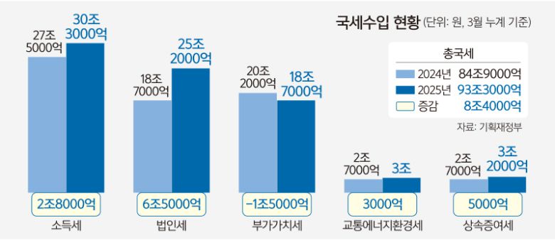 올해 3월까지 국세 수입이 93조3000억원 걷힌 것으로 나타났다. 작년 같은 기간보다 8조4000억원 늘었다. 지난해 12월 결산법인의 사업실적 개선 등의 영향으로 법인세가 작년보다 6조원 이상 늘면서 증가세를 이끌었다. 국세 수입이 작년보다 호조세를 보이고 있지만 정부가 올해 계획한 본예산 전망치(382조4000억원)를 달성할 수 있을지는 ‘미지수’다. 올해 정부가 계획한 수준 자체가 지난해 결산 대비 13% 이상 높은 데다 미국발 관세전쟁 여파 등으로 성장률 전망치가 낮아지고 있어 올해 세입여건 역시 불확실성이 크기 때문이다.