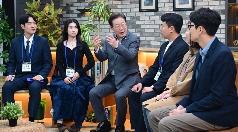 이재명 더불어민주당 대선 후보가 30일 서울 구로구 한 스튜디오에서 열린 ‘슬기로운 퇴근생활’ 직장인 간담회에서 이야기를 하고 있다. 국회사진기자단