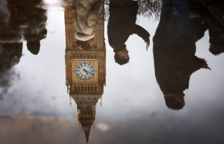브렉시트 5주년인 지난 1월 31일 영국 런던의 영국 의회 밖 물웅덩이에 보행자들과 엘리자베스타워(빅벤)가 비치고 있다./EPA 연합뉴스 |