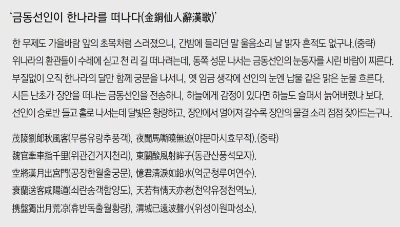 한나라가 무너진 뒤 위나라 명제(明帝)는 환관을 보내 한나라 궁궐의 금동선인을 떼어 오게 했다. 한 무제 때 만든 거대한 신선의 동상은 승로반(承露盤·하늘로부터 감로수를 받기 위한 쟁반)을 받들고 있었는데, 수레에 실어 나르기 위해 승로반을 떼었더니 금동선인이 눈물을 흘렸다고 한다. 장생불사라는 한 무제의 덧없는 욕망의 표상에 감정이입한 시인의 우울한 정서가 청각, 미각, 촉각, 시각의 이미지를 통해 도드라진다.