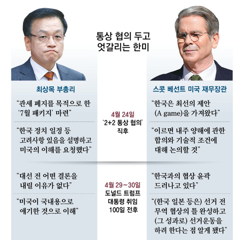 관세 협의 속도를 두고 한미 경제 수장들이 엇갈린 발언을 내놓으면서 양국의 관세 협상을 둘러싼 논란이 커지고 있다. 최상목 부총리 겸 기획재정부 장관은 “대선 전 결론을 내릴 이유가 없다”며 조속한 합의에 대한 압박은 없었다는 정부 입장을 재확인했다. 스콧 베선트 미국 재무장관이 ‘한국이 대선 전에 협상을 마무리하고 그 성과로 선거운동을 하려 한다’는 발언을 반박하고 나선 것이다.