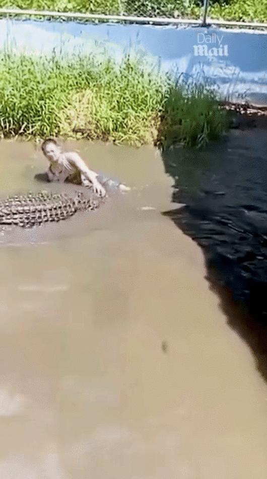 남성은 울타리를 넘어 물속을 헤쳐 나간 후 스마트폰을 꺼내 악어 옆에서 미소를 지었다. 그런데 그 순간 갑자기 악어가 반응했다.