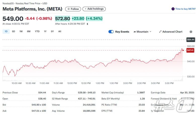 지난달 30일(현지시간) 뉴욕증시 시간외거래에서 메타는 4.34% 급등한 572.80달러를 기록하고 있다. 앞서 정규장은 0.98% 하락, 마감했었다.