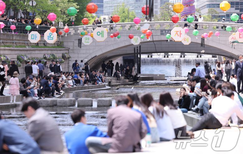 봄보다는 초여름에 가까운 날씨를 보인 지난 30일 오후 서울 청계천을 찾은 시민들이 가벼운 옷차림으로 즐거운 점심시간을 보내고 있다. 2025.4.30/뉴스1 ⓒ News1 박지혜 기자 |