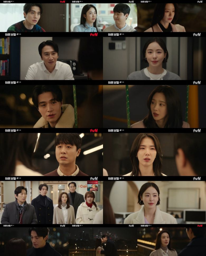 지난 29일 방송된 tvN 월화드라마 ‘이혼보험’ 10화에서는 온전한 ‘4’의 관계가 된 노기준(이동욱 분)과 강한들(이주빈 분)의 로맨틱한 입맞춤이 담겼다. 분산 투자를 주장하던 전나래(이다희 분)는 힘든 시간 자신의 옆을 지켜준 안전만(이광수 분)을 향한 올인 투자를 선언했고, 쇼윈도 부부 김선만(배유람 분)과 한여름(정가희 분)은 잘 헤어지기 위한 준비를 시작했다.