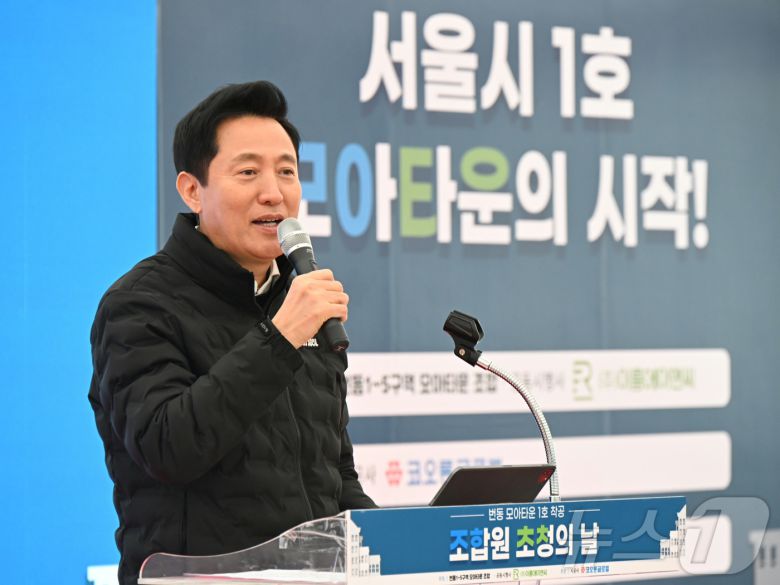 오세훈 서울시장이 서울 강북구 번동 모아타운 사업 일대에서 '번동 모아타운 1호 착공, 조합원 초청의 날' 행사에서 축사를 하고 있다. (서울시 제공) /뉴스1