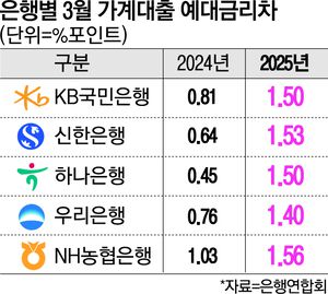 주요 시중은행들 예대금리차도 높은 수준을 이어갔다. 전국은행연합회에 따르면 3월 기준 신한은행 예대금리차는 1.53%포인트로 전월보다 0.08%포인트 올랐고, KB국민은행(1.42%포인트)은 0.09%포인트, NH농협은행(1.54%포인트)은 0.11%포인트 상승했다.