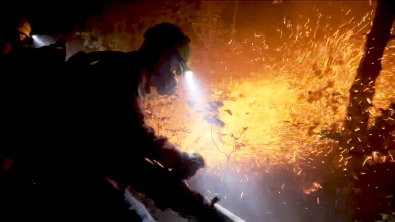 방화선을 구축한 소방대원들이 불을 잡기 위해 애쓰지만 번지는 속도가 더 빠릅니다.