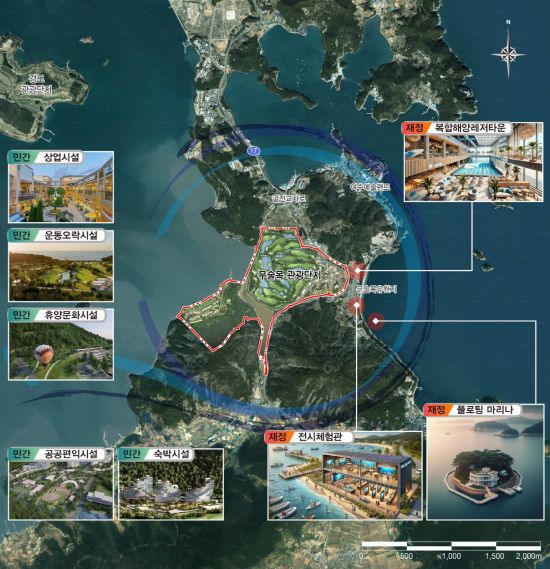 국비와 지방비가 투입되는 공공부문은 복합해양레저타운, 해양관광전시체험관, 해양관광 플로팅마리나 등 첨단 기술이 접목된 해양레저관광 인프라로 구성된다.