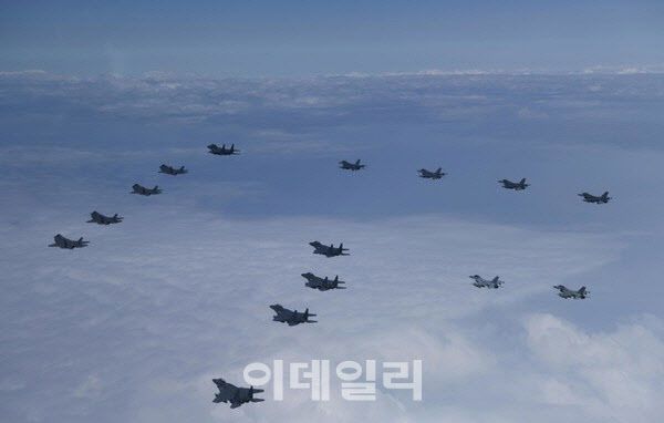 022년 한미 연합 공중무력시위 비행하는 한국 공군의 F-35A, F-15K, KF-16 전투기와 미 공군의 F-16 전투기의 모습[뉴시스 제공]