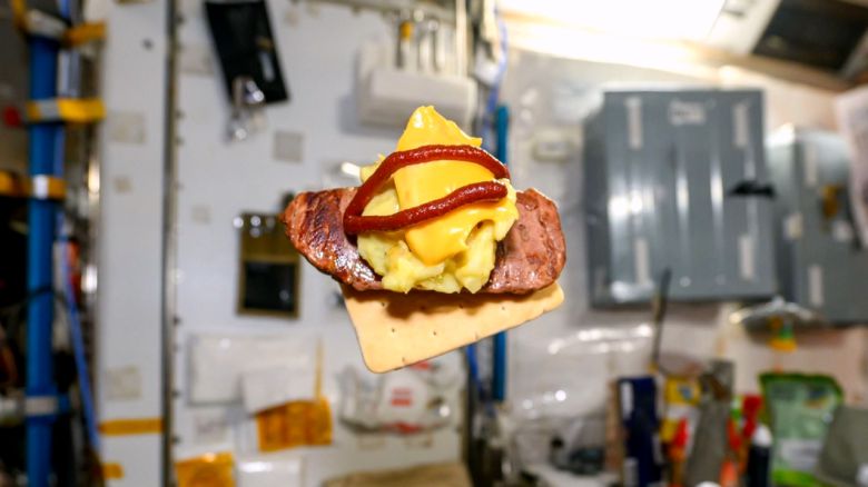 평평하게 눌러진 빵에 두꺼운 치즈, 감자 샐러드에 새빨간 소스까지, 조니 김에 따르면 전투식량인 '레인저 버거'를 우주에서 살짝 바꾼 버전입니다.