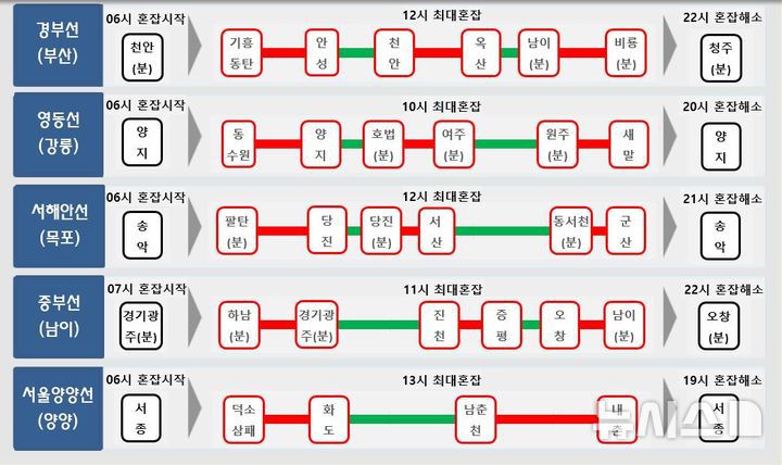 3일 지방 방향으로 ▲서울에서 대전까지 5시간 10분 ▲부산까지 9시간 ▲강릉까지 6시간10분이 소요될 것으로 보인다. 5일에는 서울 방향으로 ▲대전에서 서울까지 3시간50분 ▲부산에서 7시간 20분 ▲강릉에서 5시간까지 걸릴 전망이다.