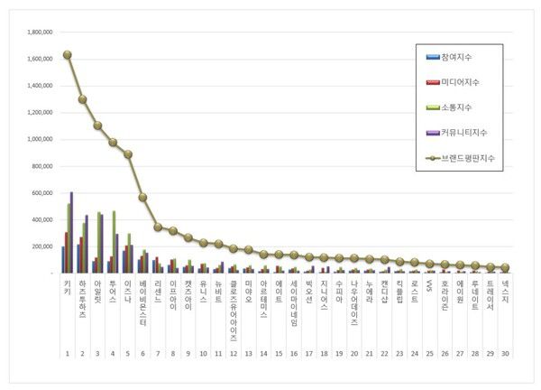신인 아이돌그룹 브랜드평판 1위를 기록한 키키 ( 지유, 이솔, 수이, 하음, 키야 ) 브랜드는 참여지수 199,634 미디어지수 305,743 소통지수 521,070 커뮤니티지수 607,919가 되면서 브랜드평판지수 1,634,366으로 분석됐다. 지난 4월 브랜드평판지수 2,359,448과 비교해보면 30.73% 하락했다.