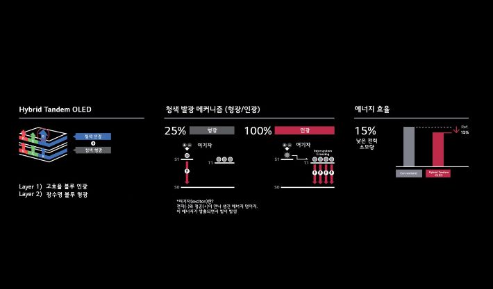 LG디스플레이는 아래층에는 청색 형광 물질을, 위층에는 청색 인광을 쌓는 하이브리드 투 스택 탠덤(2 Stack Tandem) 구조로 이 문제를 해결했다. 형광 방식의 장점인 안정성과 인광 방식의 장점인 저전력을 더해 기존 OLED 패널 수준의 안정성을 유지하면서 전력 소모량은 15%가량 절감한 것이다.