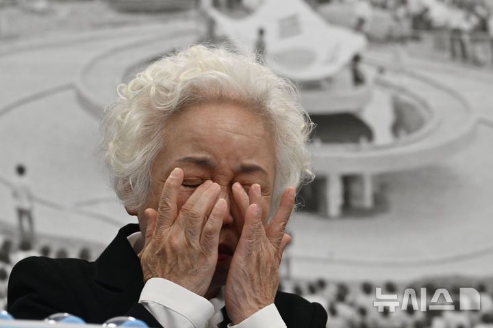 [광주=뉴시스] 이영주 기자 = 5·18민주화운동 희생자 고(故) 조사천씨의 배우자 정동순 여사가 1일 오전 5·18기념재단에서 열린 '스카이데일리 고소' 기자회견에 참석해 남편의 사망 경위를 왜곡 보도한 스카이데일리의 엄정 처벌을 촉구하며 눈물흘리고 있다. 2025.05.01. leeyj2578@newsis.com