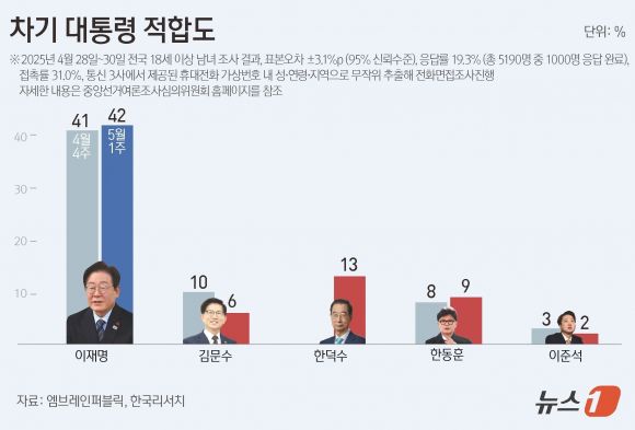[그래픽] 차기 대통령 적합도 - 엠브레인퍼블릭·케이스탯리서치·코리아리서치·한국리서치가 지난 28일부터 30일까지 전국 만 18세 이상 남녀 1000명을 대상으로 한 전국지표조사(NBS)에 따르면, 차기 대통령감으로 가장 적합한 인물이 ‘이재명’이라는 응답이 42%로 가장 높았다. 그다음으로 한덕수 13%, 한동훈 9%, 김문수 6%, 이준석 2% 등이 그 뒤를 이었다. 뉴스1 |