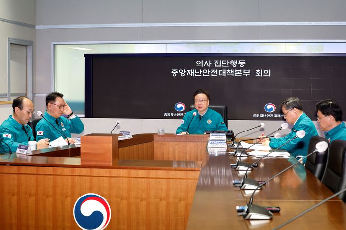 조규홍 의사 집단행동 중앙재난안전대책본부 제1차장(왼쪽 세 번째)이 1일 정부서울청사에서 열린 제99차 회의에서 발언했다.(사진=보건복지부)