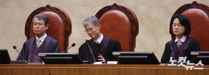 조희대 대법원장을 비롯한 대법관들이 1일 서울 서초구 대법원에서 이재명 더불어민주당 대선 후보의 공직선거법 위반 사건과 관련한 전원합의체 선고를 위해 대심판정에 착석해 있다.