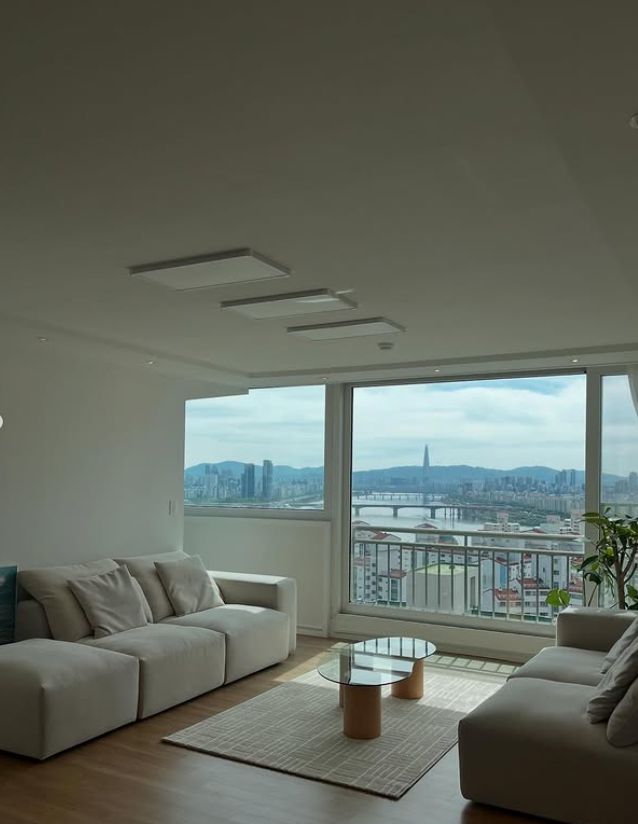 넓은 통창으로 쏟아지는 자연광과 탁 트인 한강 전망, 화이트톤의 소파와 미니멀한 인테리어가 조화를 이루며 세련된 공간미를 자랑한다. 곳곳에 놓인 식물과 감각적인 소품들이 아늑함을 더한다.