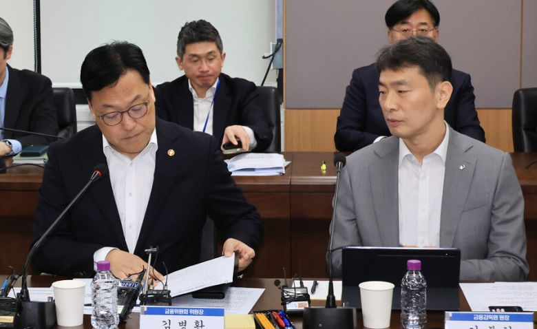 김병환 금융위원회 위원장이 지난달 7일 서울 종로구 정부서울청사에서 열린 금융 상황 점검 회의에서 이복현 금융감독원장과 대화하고 있다. 연합뉴스