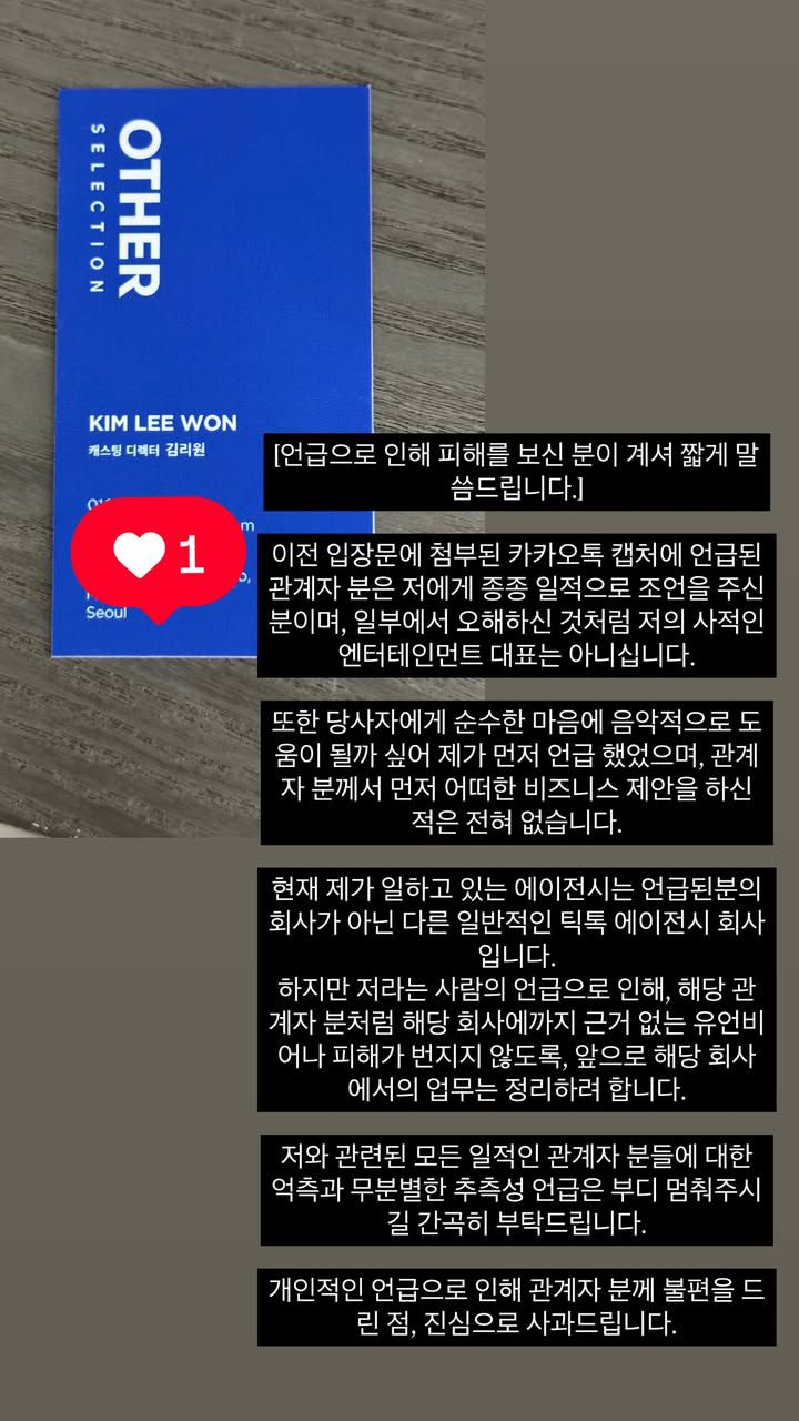 이전 입장문에 첨부된 카카오톡 캡처에 언급된 관계자 분은 저에게 종종 일적으로 조언을 주신 분이며, 일부에서 오해하신 것처럼 저의 사적인 엔터테인먼트 대표는 아니십니다.