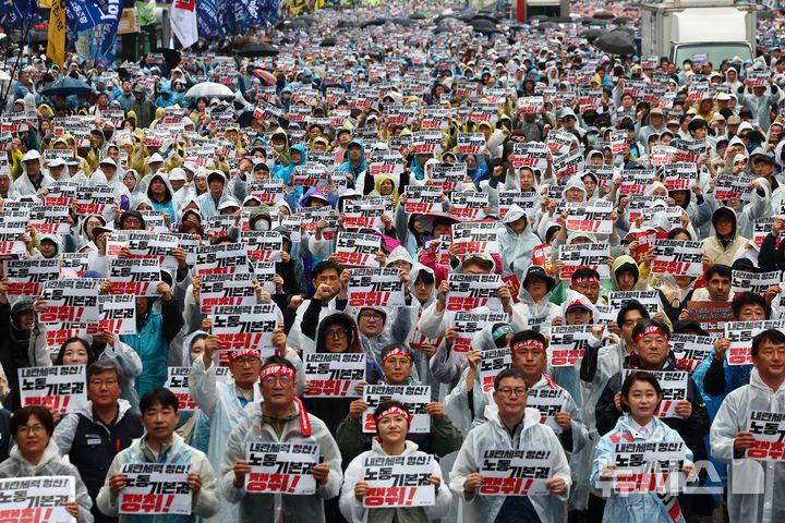 이들은 사전대회 이후 행진해 본 집회에 합류했다. 현장에 모인 참가자들은 가지각색의 우비를 입고 "내란세력 청산, 노동기본권 쟁취" "사회대개혁 실현하자" 등의 피켓을 들었다.