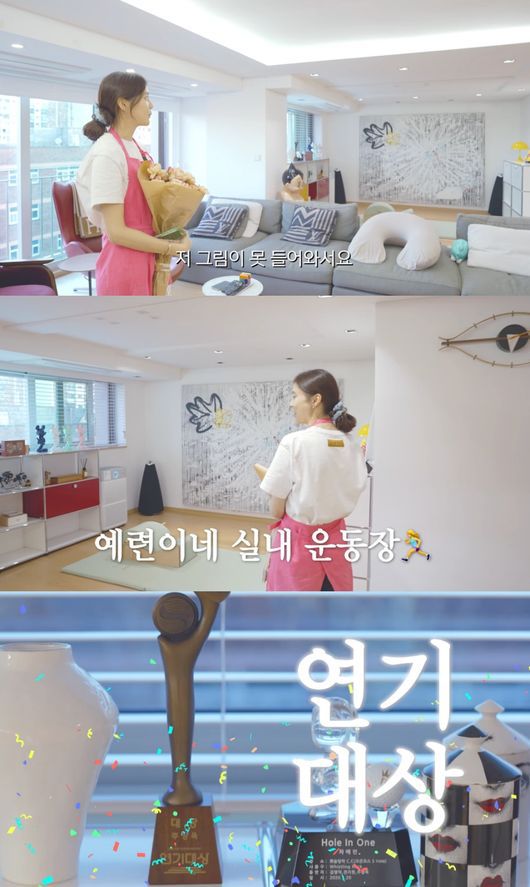 차예련은 널찍한 현관과 그림이 보이는 복도부터 제작진을 맞았다. 꽃다발 선물과 함께 웃으며 인사한 그는 "이전 집에서 4년 반 만에 이사했다"라고 밝혔다.