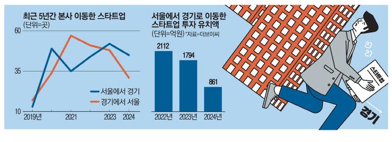 하지만 경기도로 이전한 스타트업이 맞닥뜨리는 현실은 녹록지 않다. 서울에서 경기도로 옮긴 스타트업들의 투자 유치액은 2022년 2112억원, 2023년 1794억원, 2024년 861억원으로 2년 사이에 60%나 줄었다. 같은 기간 경기도에서 서울로 이동한 스타트업 투자 유치액이 2022년 2694억원에서 2024년 1864억원으로 감소한 것과 비교하면 '탈서울'한 스타트업의 투자 유치액 감소 폭이 더 크다.