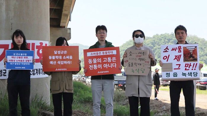 동물 학대 소싸움 폐지 전국 행동은 행사장 인근에서 릴레이 1인 시위를 열고 "전국 11개 지자체 중 5개 지자체가 대회를 포기했다"며 "달성군 또한 소싸움 대회를 폐지해야 한다"고 주장했습니다.