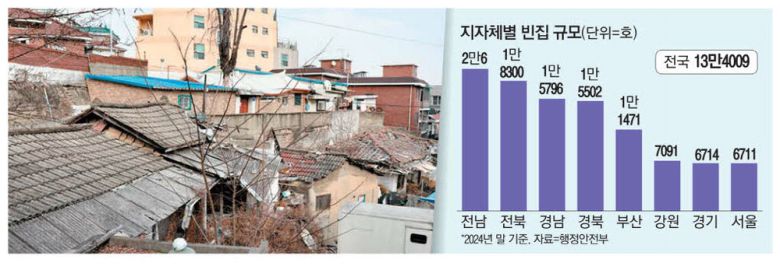 정부에 따르면 지난해 기준 전국 빈집 규모는 13만4009가구에 달한다. 이 가운데 5만7223가구는 인구감소지역에 위치해 있다. 지자체별로는 전남 2만6가구, 전북 1만8300가구, 경남 1만5796가구, 경북 1만5502가구, 부산 1만1471가구 순으로 많았다. 저출생·고령화 추세에 따라 향후 빈집이 늘어날 것이라는 게 정부의 판단이다.