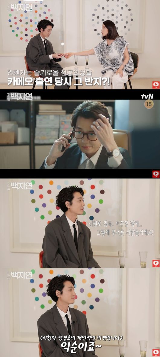 그 순간 정경호의 왼손 네 번째 손가락에 낀 반지가 포착됐다. 백지연은 자연스럽게 반지를 보며 "이 반지가 그 반지냐"라고 물었다. 최근 정경호가 '슬기로운 의사생활'의 신규 시리즈인 '언젠가는 슬기로울 전공의생활'에 김준완으로 다시 등장해 반지를 낀 모습으로 화제를 모았던 것이다.