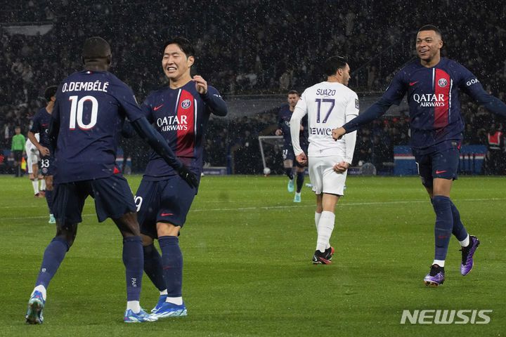 [파리=AP/뉴시스] 파리 생제르맹(PSG)의 이강인이 지난해 1월3일(현지시각) 프랑스 파리의 파르크 데 프랭스에서 열린 2023 트로페 데 샹피옹(프랑스 슈퍼컵) 툴루즈와의 경기 전반 3분 선제골을 넣고 도움을 준 우스만 뎀벨레(왼쪽)와 기쁨을 나누고 있다. 이강인은 선제 결승 골로 PSG의 2-0 승리와 슈퍼컵 우승을 이끌며 MVP에도 선정됐다. 프랑스 슈퍼컵은 같은 시즌 프랑스 리그1 챔피언과 쿠드 프 프랑스(프랑스컵) 우승팀이 단판 승부로 우승을 가리는 대회다. 2024.01.04.